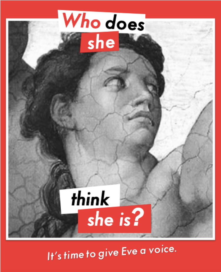 Artist statement: This piece is a visual interpretation of Aemelia Lanyer’s Eve’s Apology in Defense of Women that was inspired by Barbra Krueger’s pieces from the 1980s.