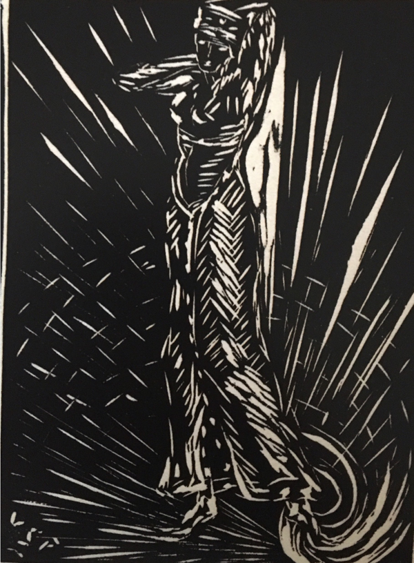 The drawings and writings of Postel du Mas help to illustrate this point. In his drawings, the figure of Saint-Point is vaguely feminine, but the focus is not on her as a sexualized woman, rather Postel du Mas focuses on her as a dynamic force in the space of the performance. Postel Du Mas’ drawings portray what was his “ideal form of the dancer, where feminine and masculine differences resolve in a magical equilibrium.”[xxvii] Saint-Point’s practice of wearing veils during her performance, influenced by Symbolist performance techniques, in order to “depersonalize the performer” by hiding the traits of an individual revealed by the face, also worked to force the attention of the audience away from her as a distinct individual performer and towards a closer attention to her movements.[xxviii] The woodcuts that Saint-Point made herself, based off the drawing of Postel Du Mas further eliminate definite marks of gender as to focus more on the motion of the dancer through short thick lines (Fig. 3).