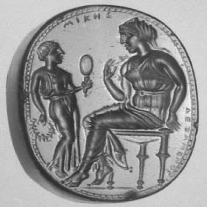 Figure 2: Seal of Mikê, mid-fifth century BCE. Scaraboid, sapphirine chalcedony, 2.2 1.7 0.8 cm. Cambridge: Fitzwilliam Museum. Photo: Beazley Archive, University of Oxford, Claudia Wagner.