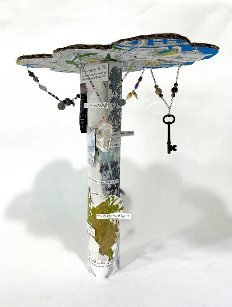 This is a collage that represents myself with a tree because I feel connected to them, and they represent growth. I used the Xerox transfer technique to adhere images that represented me such as pictures of mushrooms, tea, and Ocean City to the trunk. I covered the top of the tree with a map of my hometown, Ocean Pines, and draped some unfinished jewelry projects under the top.