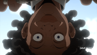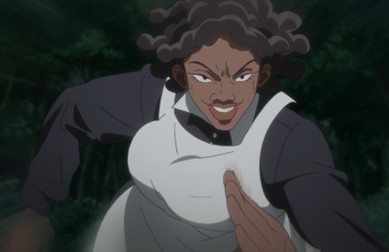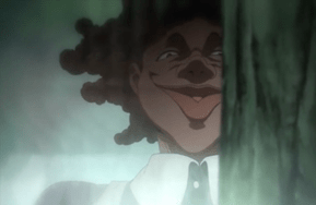 Although the character of Krone actually does work to resist a harmful stereotype of Black people by illustrating why such a label could never be truly met in the first place, the image itself when separately read from the show becomes a harmful racial caricature of a population that is already hyper-visible in the country the image stems from, making Krone a tragic character on-screen and off. On screen, her original ambitions are dashed and replaced with the grim inevitability of death in subjugation. Though she tries her best to conform to the standards set by her captors, she is cruelly killed when her ambition to be the best becomes a “problem” (“021145”, 4:50) as put by a higher-up before she tells a demon to kill her. Off screen, her tragic story is overshadowed by the more iconic images of her as she wildly chases after the kids or grins wide-eyed and baring her teeth like an animal ready to pounce. Though Krone’s story is one that highlights the dehumanizing nature of subjugation, out of context, these images of her can put her on par with the Looney Tunes’ All This and Rabbit Stew or Don Raye’s Scrub Me Mama with a Boogie Beat in terms of the racial damage they can do. The Promised Neverland subverts the Mammy stereotype by weaving a character arc that highlights the tragedy of being trapped in subjugation, but ultimately, does harm to the image of African American women by going too far with the form in which they did it.