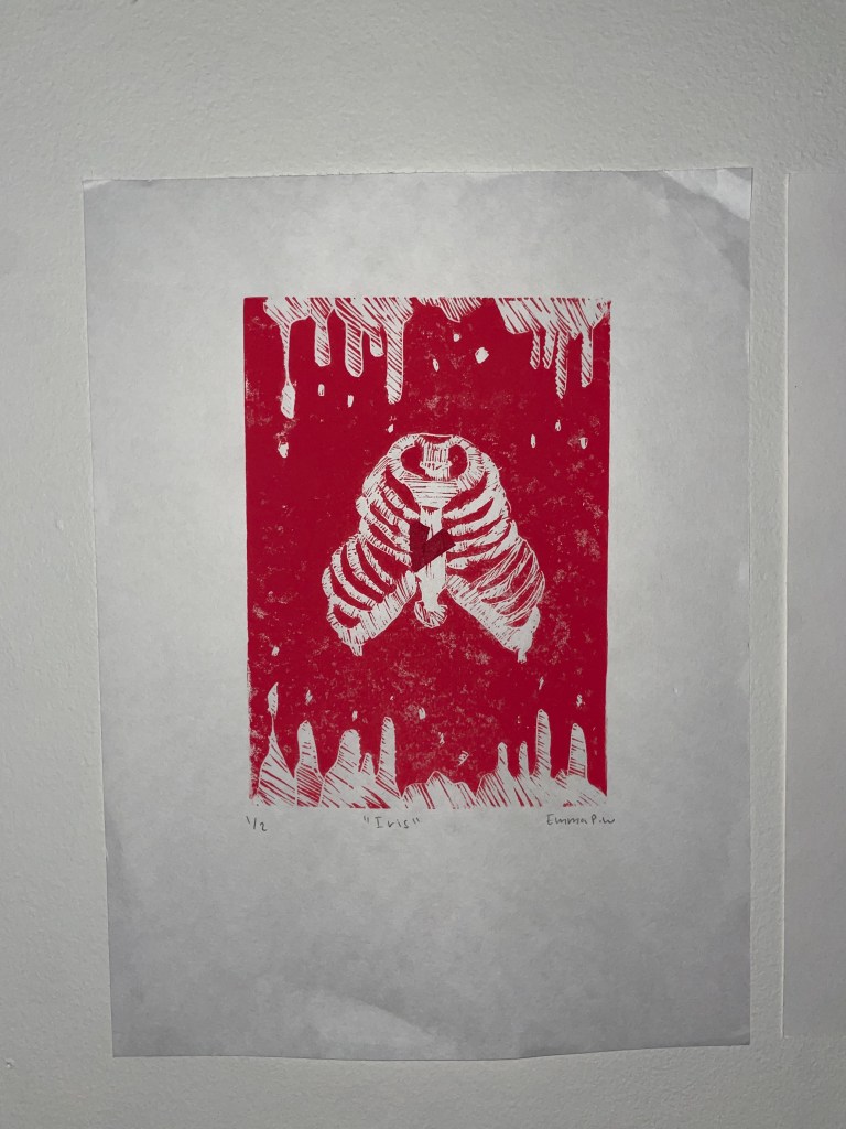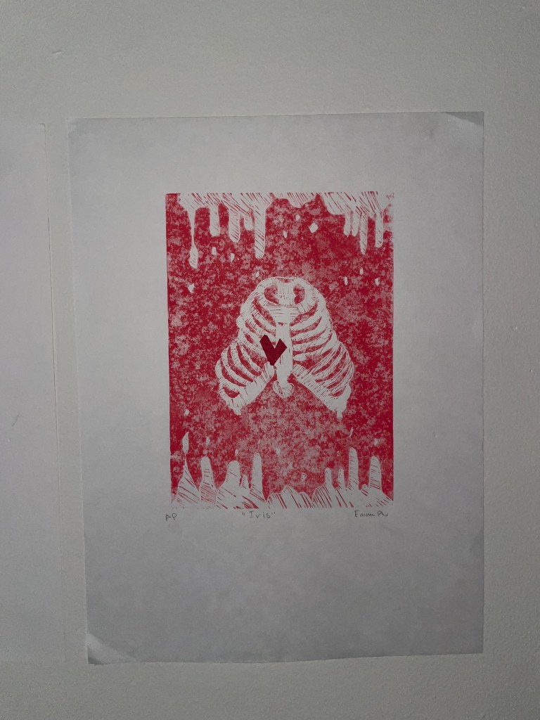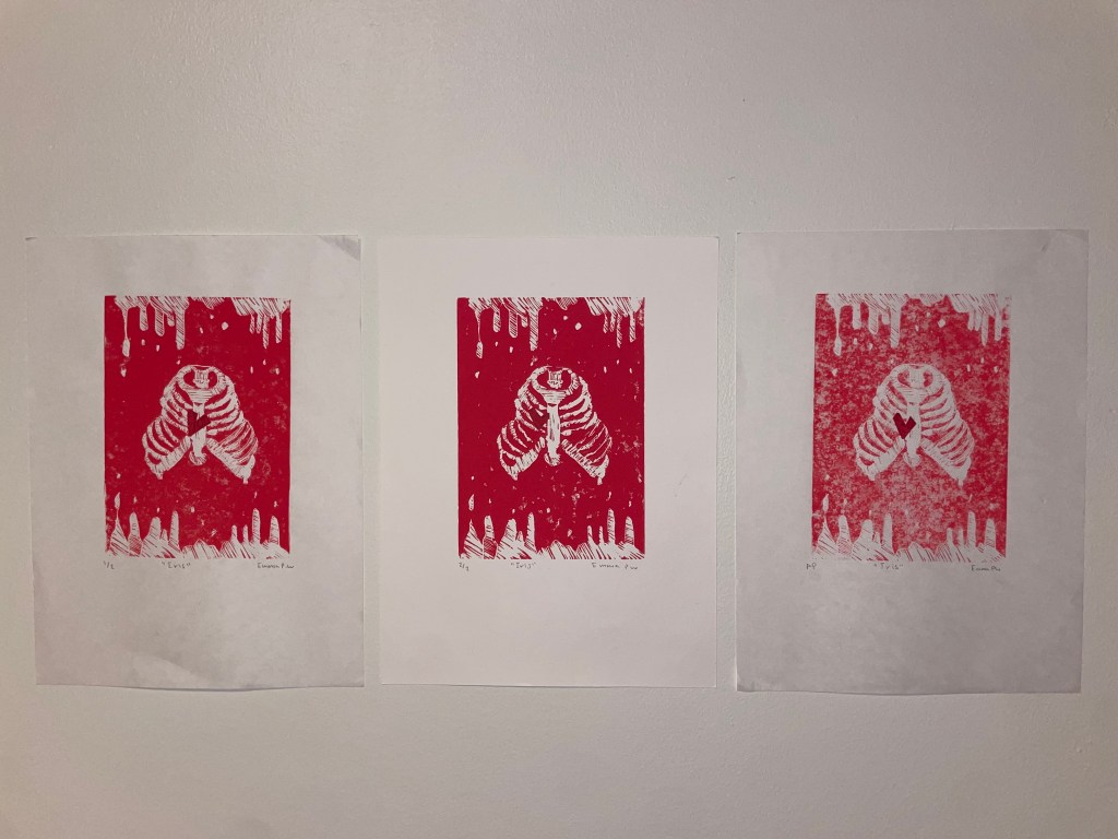 Brief Description: The prompt for this piece was to create a monochromatic relief print from a linoleum block that played on the notion of repetition. Inspired by my skeleton tattoo on my forearm, I decided to sketch out and carve away a rib cage. I chose to add a heart made of tissue paper to each print to add a playful feel. When thinking of how to add to the space surrounding the rib cage, I decided to mirror blood droplets on the block’s top and bottom. This is where my title of the piece was drawn from. In the song “Iris” by the Goo Goo Dolls, there’s a lyric “You bleed just to know, you’re alive.” When thinking of our skeleton, we don’t necessarily think of it as a living part of us, but it is. It supports our living systems. This piece is about living in the moment and interconnectedness to oneself.