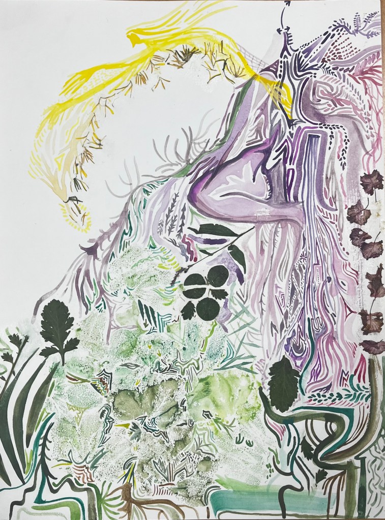 Brief Description: Following the prompt of “Landscape” this piece blends a surrealist world where trees are hands and figures are bodies of water. Using ink and acrylic, this piece aims to find the intersection of intensity and gentleness.