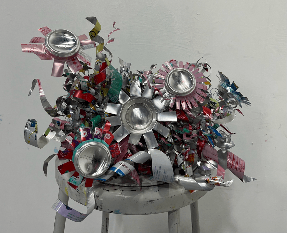 Brief Description: I have been interested in working with cans for a long time because how malleable and shiny they are. The cutting and twisting of each individual can places emphasis on the importance of process in my work. This piece is also always evolving as pieces untangle themselves or more twists are added.