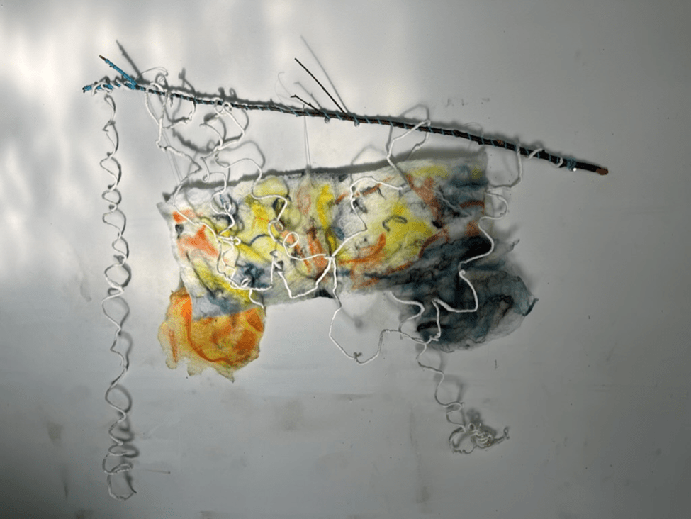 Materials: felt, paper thread, yarn, fishing wire, and a stick