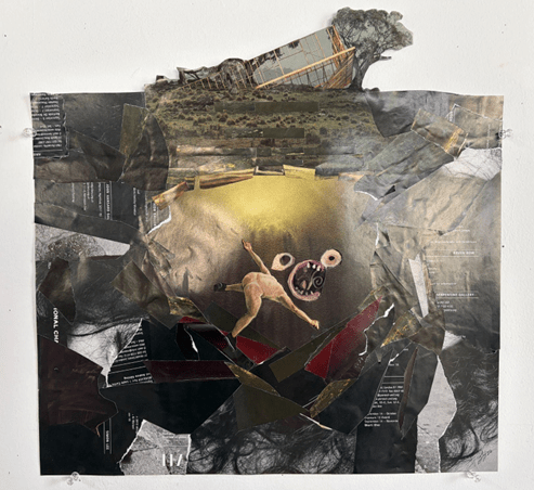 Short Description: For this assignment, students were tasked with creating a surrealist world completely comprised of already existing images on a large canvas. In an effort to focus on the layering of distinct colors and image textures, Dorman created a scene of something (or someone) falling into a dark hole underneath an overturned framing of a house. The image is more exploratory than introspective, but still invites conversation using just a hint of a narrative in the piece.